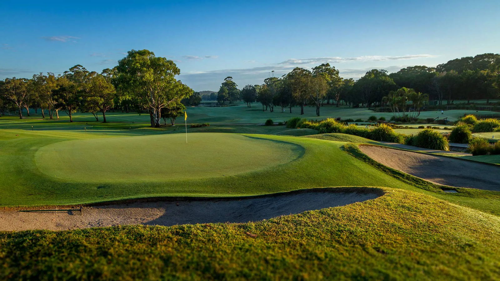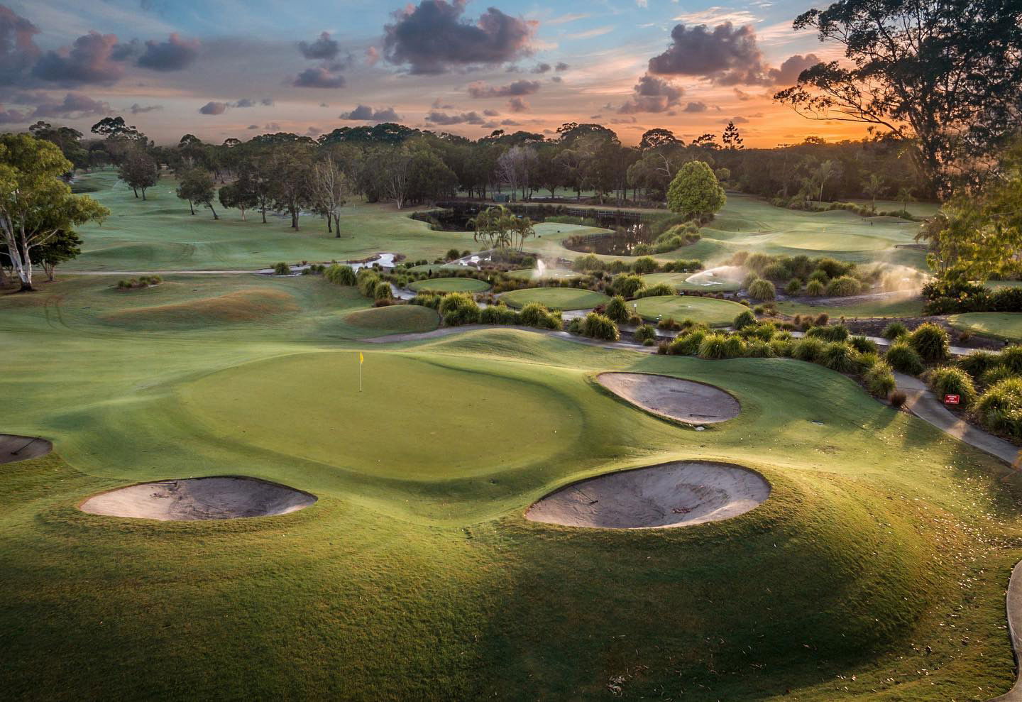 The course layout includes an east-west orientation on the front nine, offering ocean views, and a north-south orientation on the back nine, with vistas of the iconic Cape Byron Lighthouse. The signature 13th hole, a 538-meter par 5, is notable for its elevated tee and a green guarded by water hazards and bunkers, demanding precise shot-making.