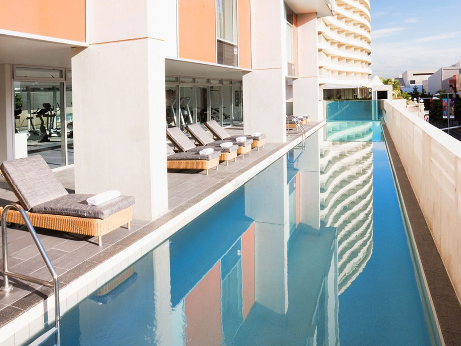 Guests are invited to relax in the hotel’s heated 20-metre lap pool suspended above the restaurant, unwind in the spa, or keep active in the fully equipped fitness centre. On-site dining is elevated at the vibrant Ovello Bar & Kitchen, serving Mediterranean-inspired share plates and stone-baked pizzas in a bright, casual setting.