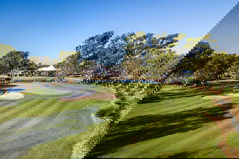 - 18 holes at Palm Meadows Golf Club, shared motorised carts included
